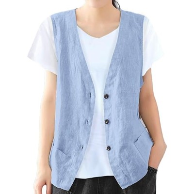 Womens Cotton Linen Vest Casual Sleeveless Blazer Cardigans Lightweight Jacket Waistcoat