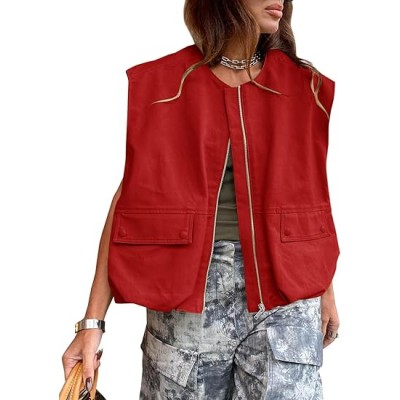 Womens Casual Zip Up Cargo Vest Oversized Crewneck Ruched Hem Sleeveless Blazer Jackets Tops