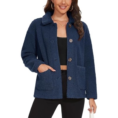 Womens Sherpa Fleece Jackets Fuzzy Warm Winter Jackets Button Down Teddy Coat Long Sleeve Outwear with Pockets