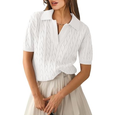 Women's Short Sleeve Sweaters Tops Polo V Neck Cable Knit Casual Soft Pullover Shirts Summer Outfits