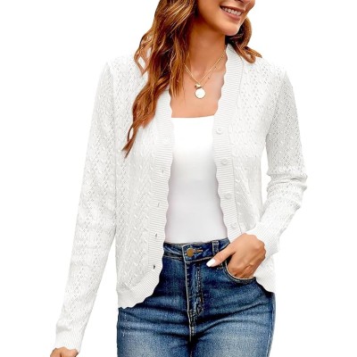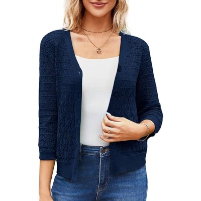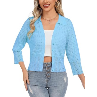 Women's Sleeve Crochet Knit Button Down Cardigan Cropped Shrug Bolero Lightweight Sweaters Tops