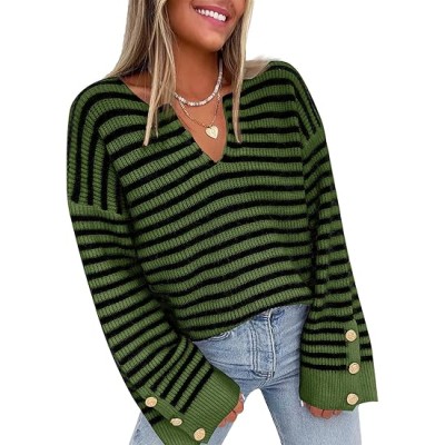 Womens Striped V Neck Batwing Long Sleeve Chunky Sweater