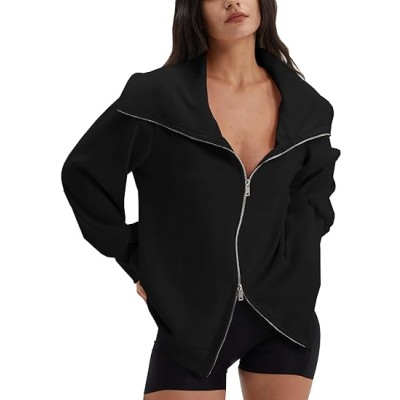 Women's Zip Up Oversized Sweatshirts Long Sleeve Collared Casual Jacket Trendy Clothes with Pocket