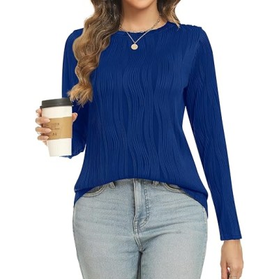 Women's Long Sleeve Crewneck Shirts Textured Tops Fashion Fall T-shirt Business Casual Plain Tee Blouses