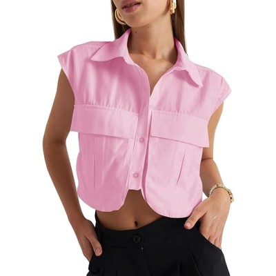 Womens Button Down Shirts Cute Summer Cap Sleeve Crop Tops Blouse