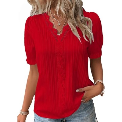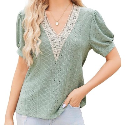 Womens Puff Sleeve Tops Summer Lace V Neck Short Top Trendy Casual Basic Blouses