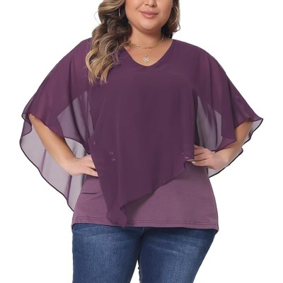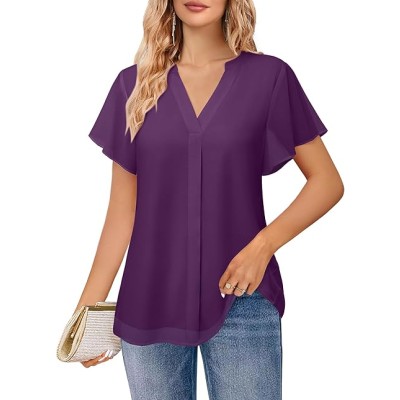 Womens Short Sleeve V Neck Double Layers Chiffon Blouses Dressy Casual Tunic Tops