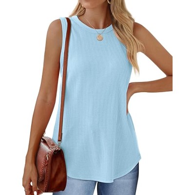 Crewneck Soft Waffle Knit Tank Top Women Loose Fit Curved Hem Cotton Beach Tops Trendy