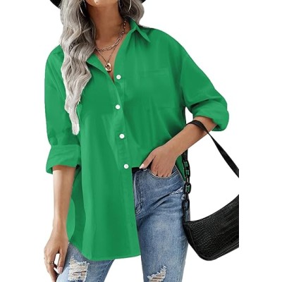 Women Button Down Shirts Office Drop Shoulder Oversized Blouse Long Sleeve Boyfriend Dress Shirt with Pocket